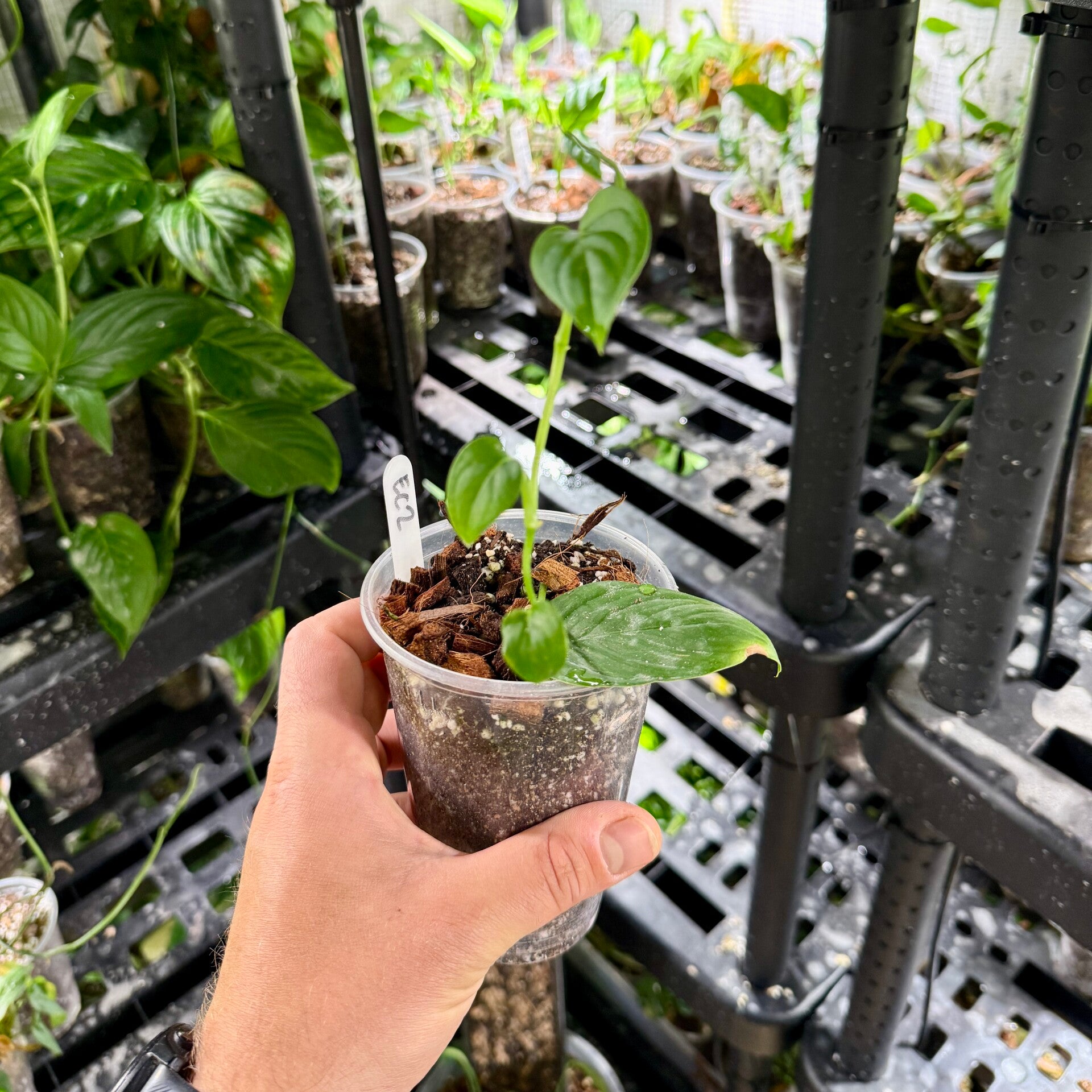 Die EC2 wächst als kletternde Pflanze mit eher aufrechter, aber dennoch flexibler Triebentwicklung. Mit Unterstützung durch eine Moos- oder Rankhilfe entwickelt sie einen kompakten, dichten Wuchs. Aufgrund ihrer eleganten Erscheinung eignet sie sich hervorragend als Solitärpflanze auf Moosstab oder als Teil eines größeren Indoor-Dschungels.
